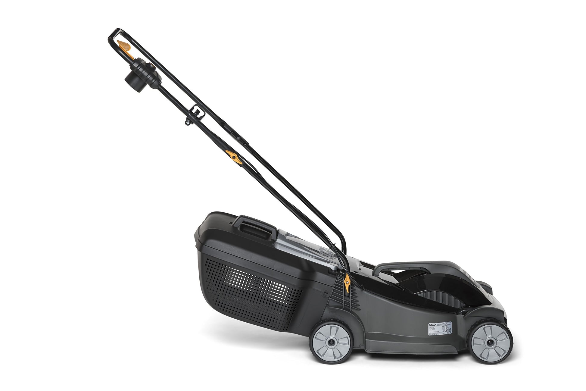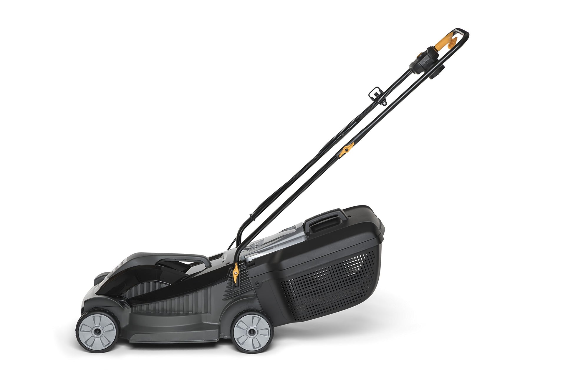 - Motor eléctrico de 1400 W, Cero emisiones gracias a la alimentación eléctrica, Altura de corte ajustable en el eje en 3 posiciones (25-65 mm), Empuje manual, Ruedas esculpidas de 140/140 mm