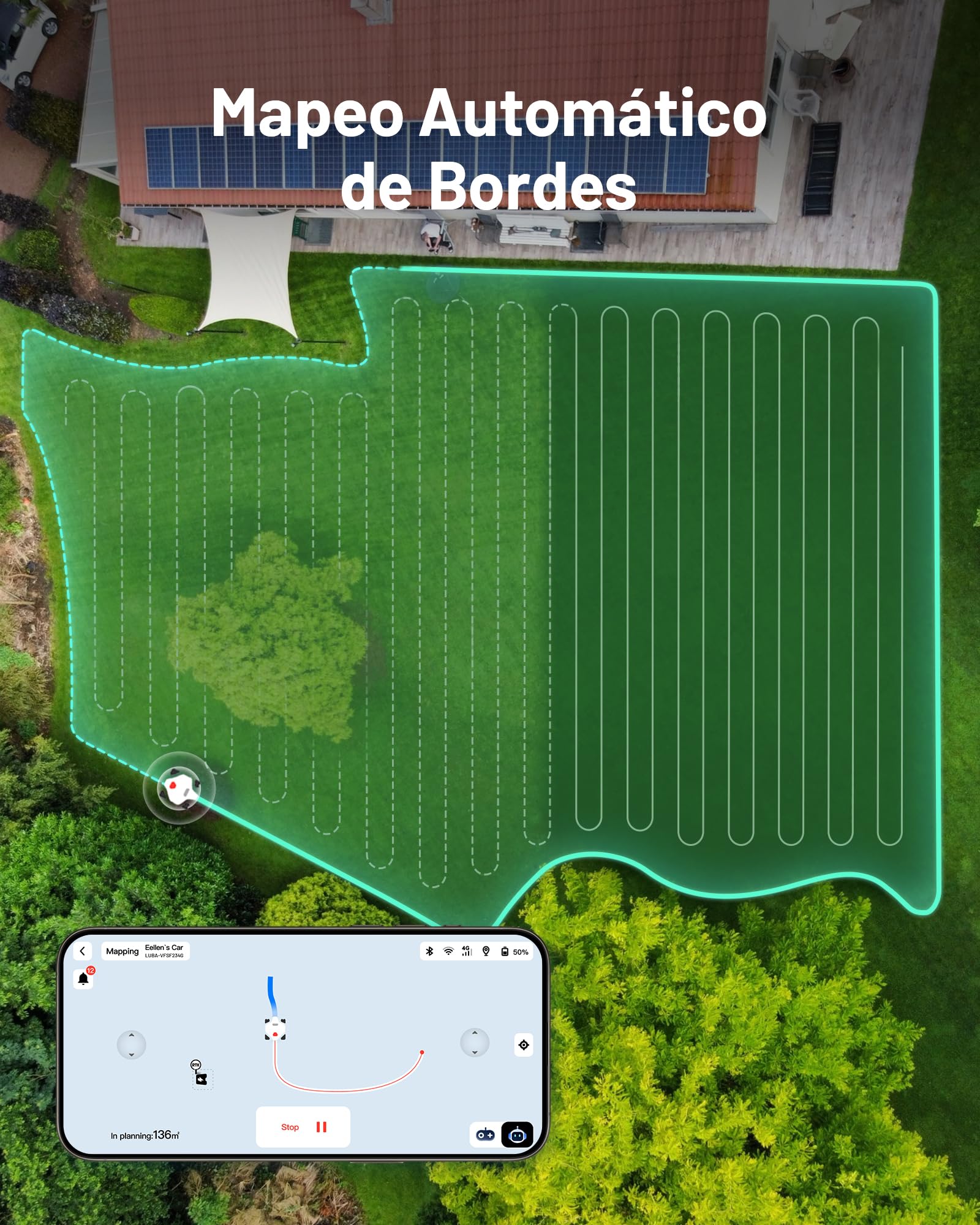 - Más Allá del Posicionamiento: Más allá de la determinación de la posición, UltraSense AI Vision permite segar hasta 300m en zonas sin señal, como debajo de árboles o en caminos estrechos. LUBA 2 AWD captura visualmente el césped, detecta los bordes bajo árboles o aleros y mapea dinámicamente más de 3.000m². Potente posicionamiento visual, identifica con precisión céspedes y bordes, sin modos preestablecidos.