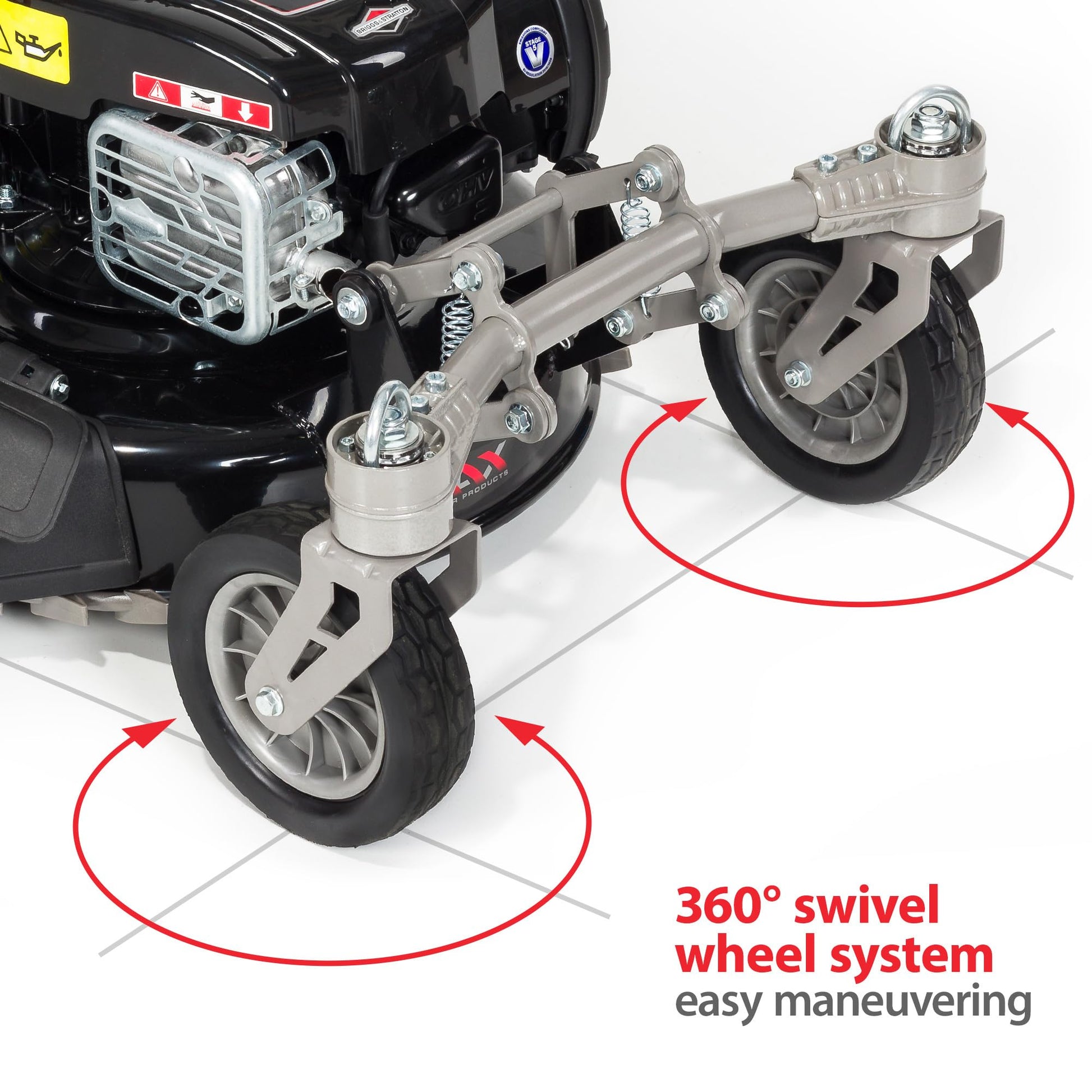 - La solución innovadora que consiste en el uso de dos ruedas giratorias delanteras facilita llevar el cortacésped entre obstáculos