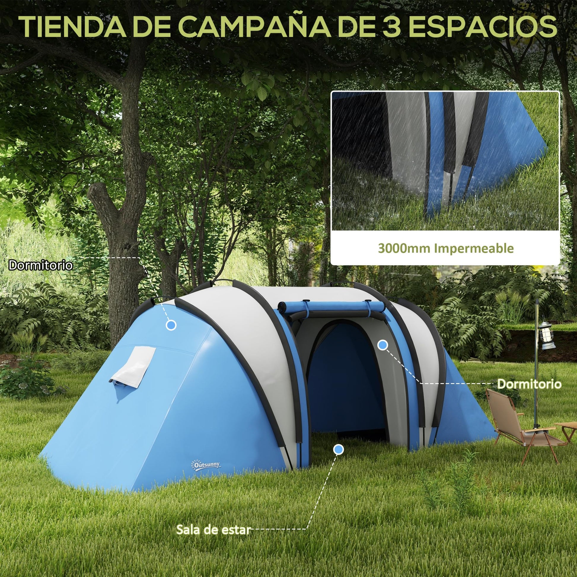 Outsunny Tienda de Campaña Familiar para 4-5 Personas Tienda de Acampada de Túnel Impermeable 3000 mm con 2 Dormitorios Bolsa de Transporte y Gancho para Pescar Senderismo Azul