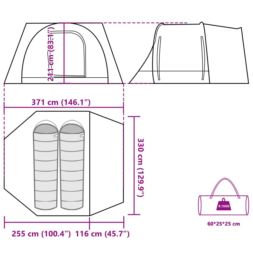 Color: Azul Material: Poliéster 185T con revestimiento de PU Dimensiones totales: 371 x 330 x 211 cm (largo x ancho x alto) Dimensiones del embalaje: 60 x 25 x 25 cm (largo x ancho x alto) Capacidad para dormir: 2 personas Peso: 8,15 kg Tipo de tienda: Tienda de coche Número de dormitorios: 1 Número de puertas: 2 Número de ventanas: 1 Con doble acceso con cremallera Con E-port Requiere montaje: Sí La entrega contiene: 1 x Tienda 1 x Bolsa de transporte