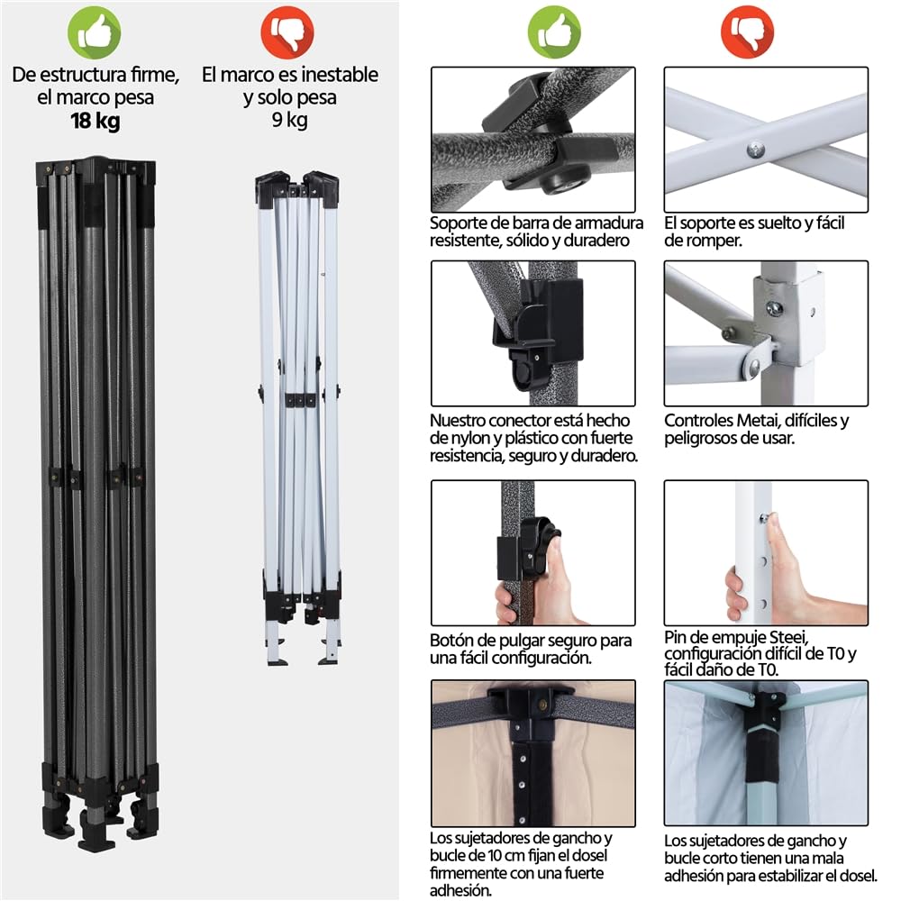 - Materiales Seleccionados: Este cenador desplegable para exteriores de 3 × 3 m de robusto marco metálico está hecho de poliéster con un revestimiento de poliuretano y protección UPF 50+. Es ideal para uso exterior